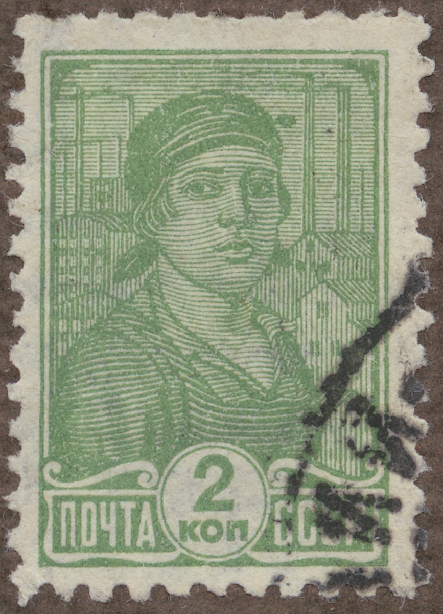 Frimärke från Ryssland, 1929. Motiv av Ugnsarbeterska Fabriker i bakgrunden