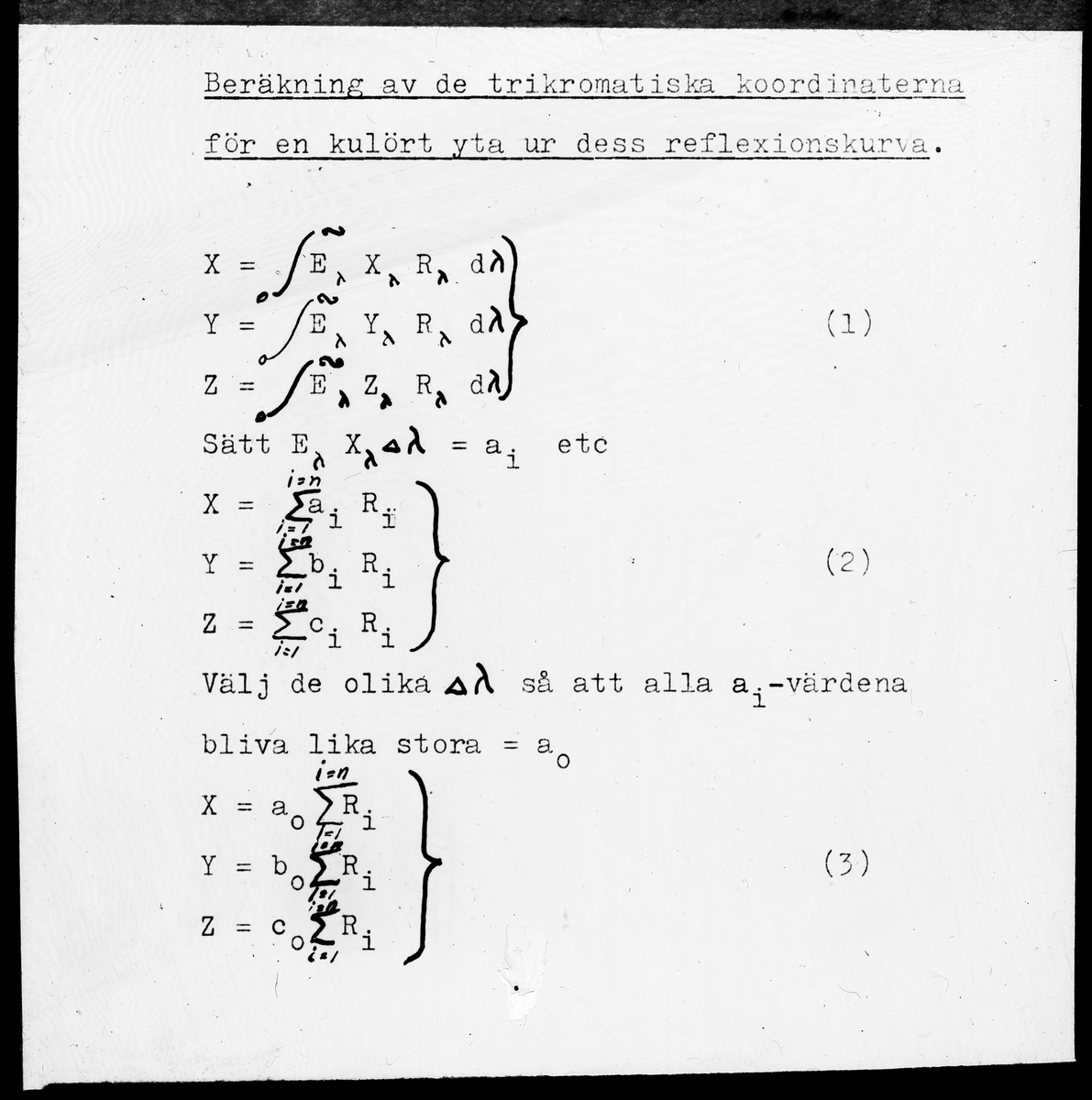 Beräkning av de trikromatiska koordinaterna för en kulört yta ur dess reflexionskurva.