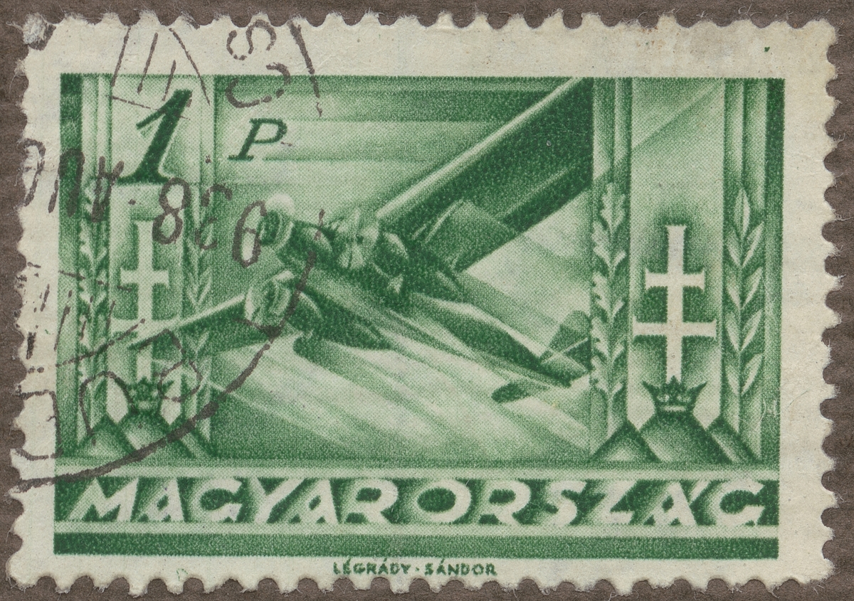 Frimärke från Ungern, 1936. Motiv av Tremotorigt monoplan "-Flygplan serie.-" Luftpost