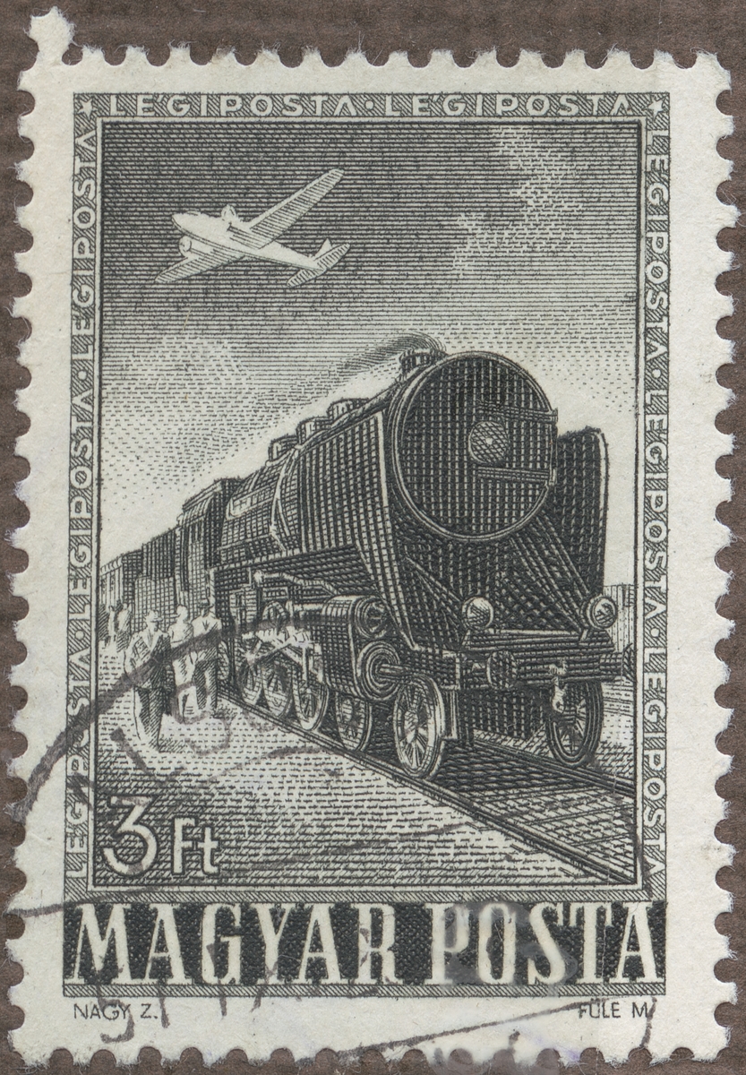Frimärken ur Gösta Bodmans filatelistiska motivsamling, påbörjad 1950. Frimärke från Ungern, 1950. Motiv av Stort ånglokomotiv Monoplan