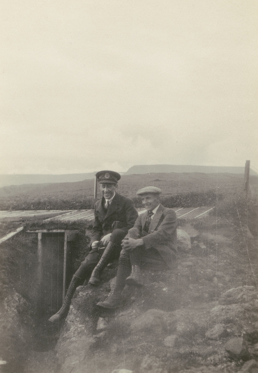 Fotografi från Albin Ahrenbergs resa till Grönland 1929. Motiv av två män som sitter och vilar i ett bergslandskap. Troligen Island.