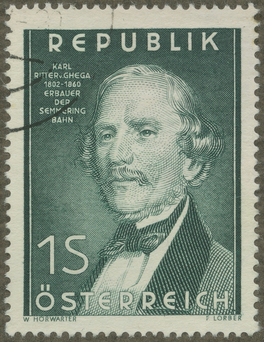 Frimärke från Österrike, 1954. Motiv av Karl Ritter von Ghega: 1802-1860. Österrikisk ingeniör. Byggde 1848-1854 Semmeringbanan, den äldsta av Europas större bergbanor.