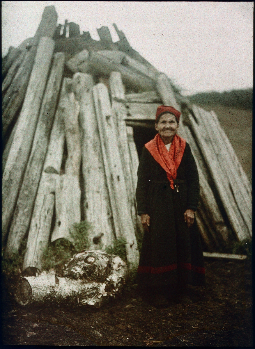 Agfa-autokrom. Porträtt av gammal samekvinna utanför kåtan. Västerbottens inland.