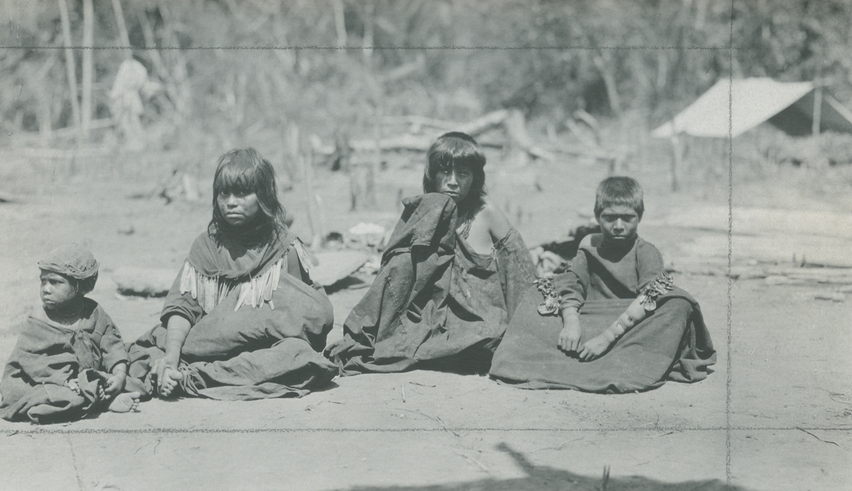 Fotografi från expedition till Peru 1920. Motiv av kvinnor och barn som sitter på marken i djungeln.