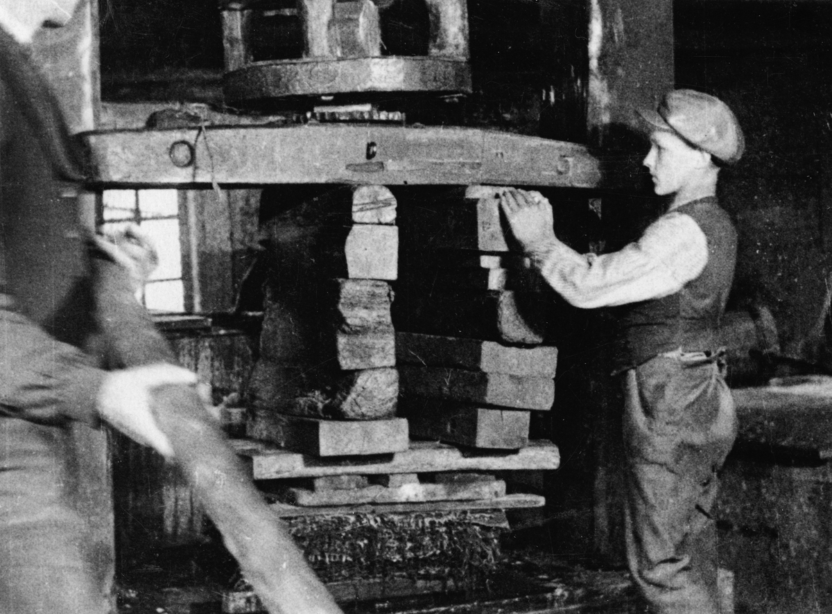 Ösjöfors handpappersbruk. Vattnet urpressas i pappersarken.