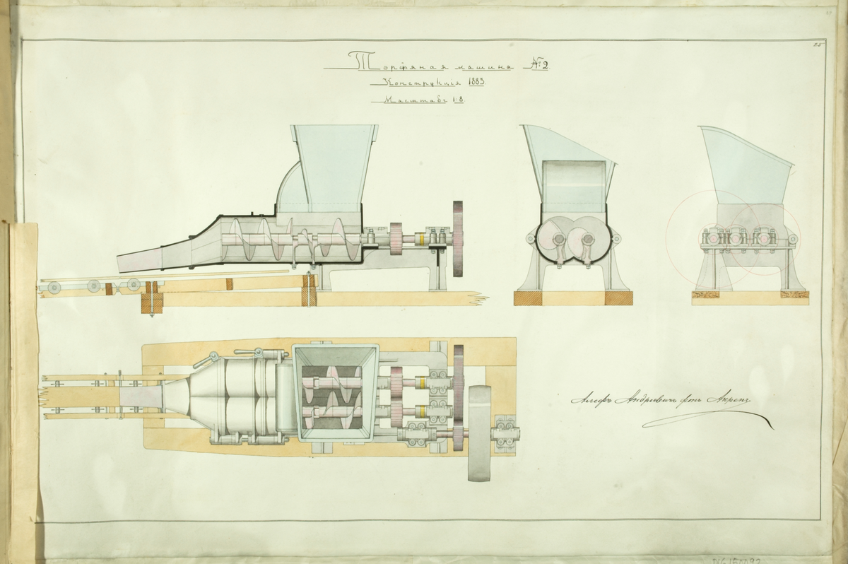 Skiss på ryska 1883, ur boken med ritningar mm 1868-1887, av den svenske torvmaskinkonstruktören Aleph Anrep.
