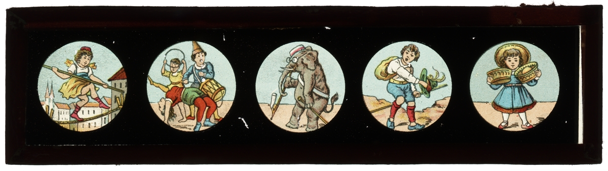 Motiv av lindansande flicka, trumslagarprojke med akrobater, elefant, pojke samt flicka.