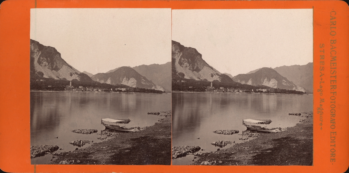 Stereobild av liten båt invid strand, Lago Maggiore (Lago Verbano).