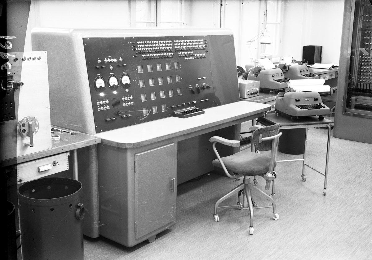 Dokumentation av byggandet av matematikmaskinen BESK på Drottninggatan i Stockholm. Manöverbord från tidigt skede innan bildrör monterats.