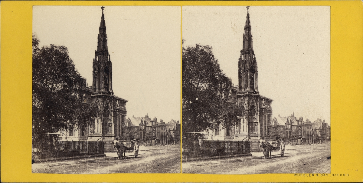 Stereobild av häst och vagn invid minnesmonumentet "Martyrs' Memorial" i Oxford, Storbritannien.