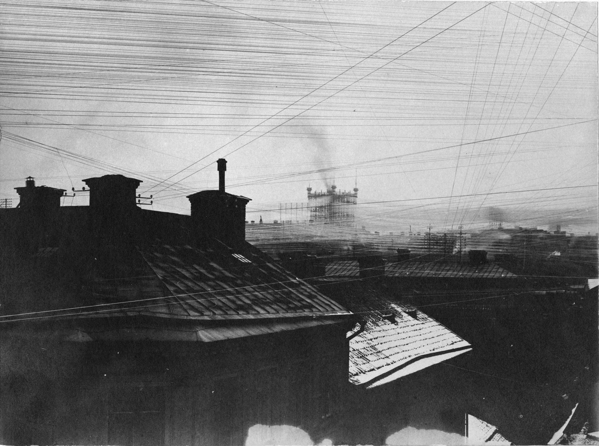 Vy av "luften" i Stockholm den 5 februari 1892. Med Telefontornet vid Malmskillnadsgatan 30 i Stockholm.