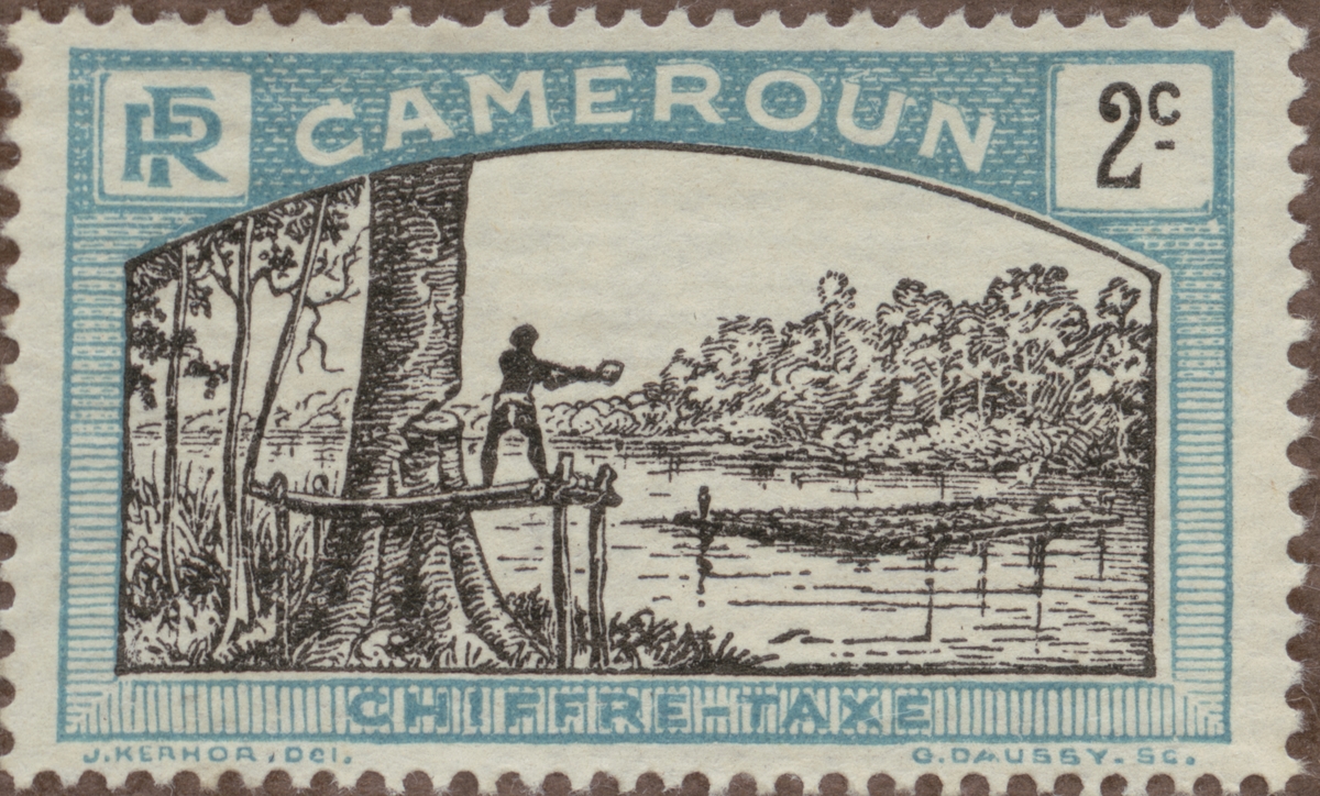 Frimärke från Kamerun, 1925. Motiv av fällande av Mahognyträd.