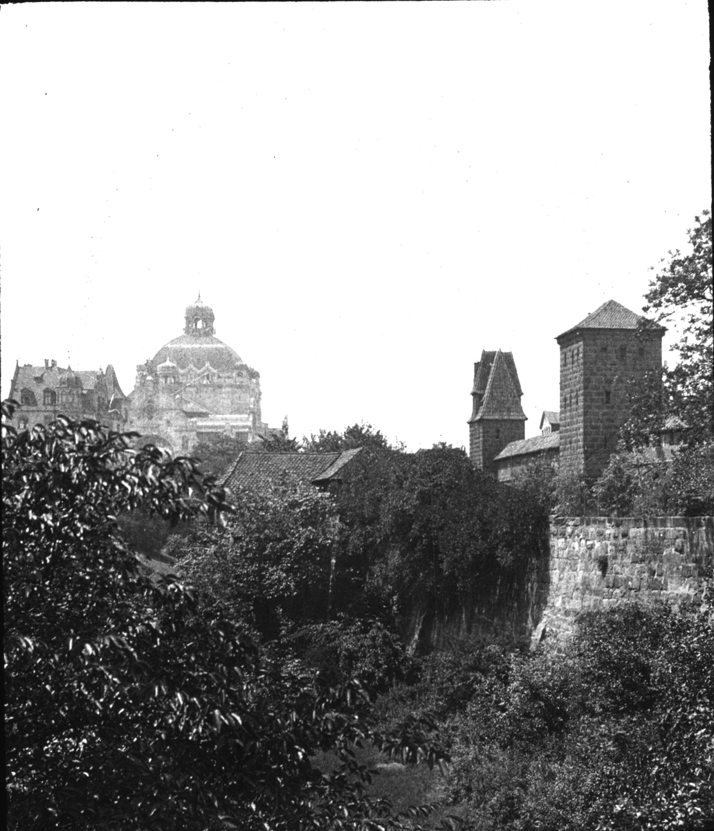 Skioptikonbild med motiv av vy över Burg Nürnberg (Kaiserburg). Slottet i Nürnberg.