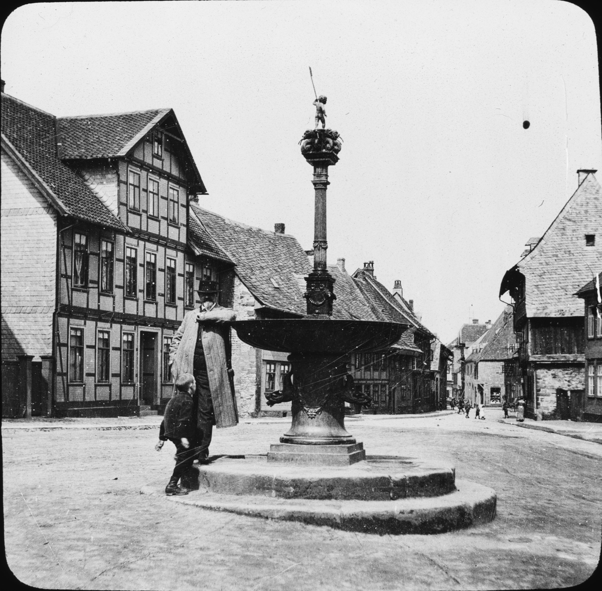 Skioptikonbild med motiv från Frankenberger Plan i Goslar. Mannen vid fontänen är troligen professor Paul Clemen, bekant till Sigurd Curman.