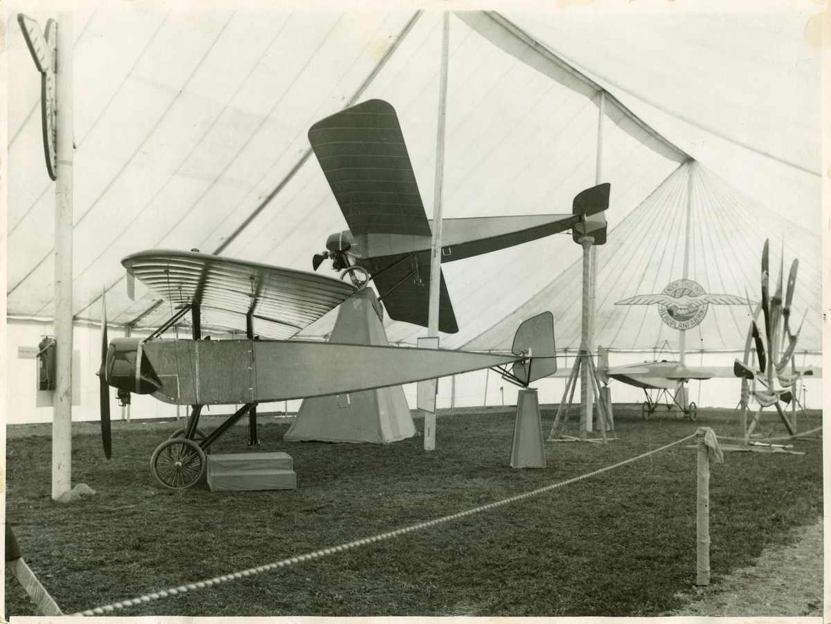 Svenska Aeronautiska Sällskapets utställning i maj 1915 vid Stallmästaregården i Stockholm. Thulinfabrikens monoplan av Morane-Saulnier-typ, byggd på fransk licens. I förgrunden ett Thulin-plan typ D (Morane- Saulnier Parasol), med först 80, sedan 90 hkr luftfylld rotationsmotor. Planet hade överliggande vinge. Topphastighet ca 115 km/tim. Bakom, upphöjt, syns två Thulinmonoplan typ B (Morane-Saulnier) med först 60, senare 90 hkr motor Le Rhône.