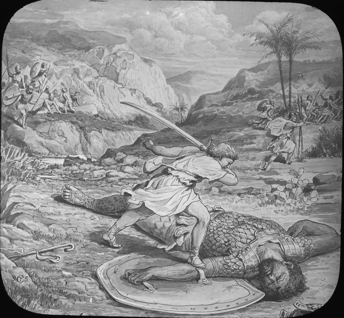 Skioptikonbild. Bibliskt motiv. David och Goliat.