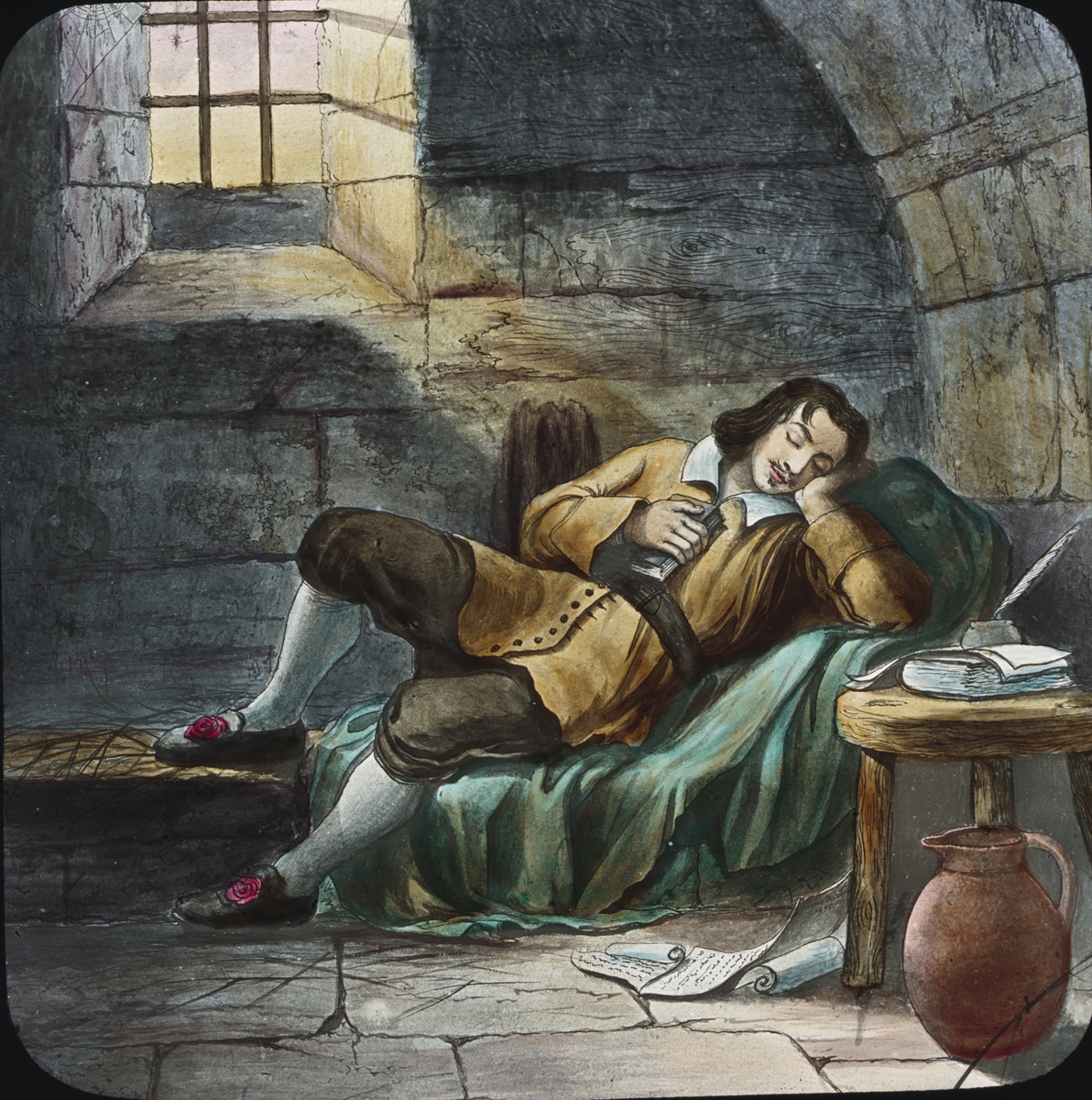 Kolorerad skioptikonbild med motiv av av sovande man. Bilden tillhör möjligen berättelsen Pilgrim's Progress.