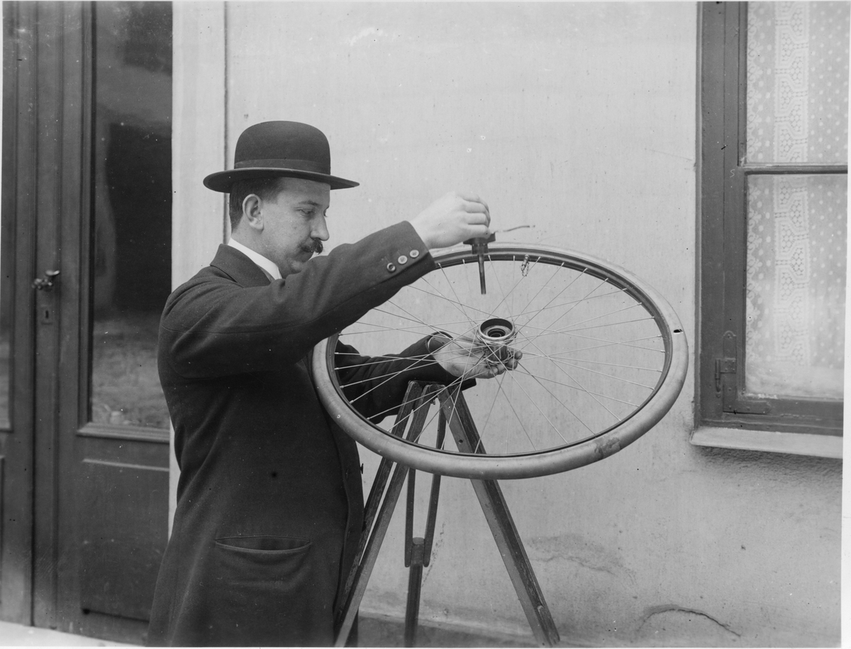 Okänd uppfinnare med patenterad bakhjulsnav omkring 1910.