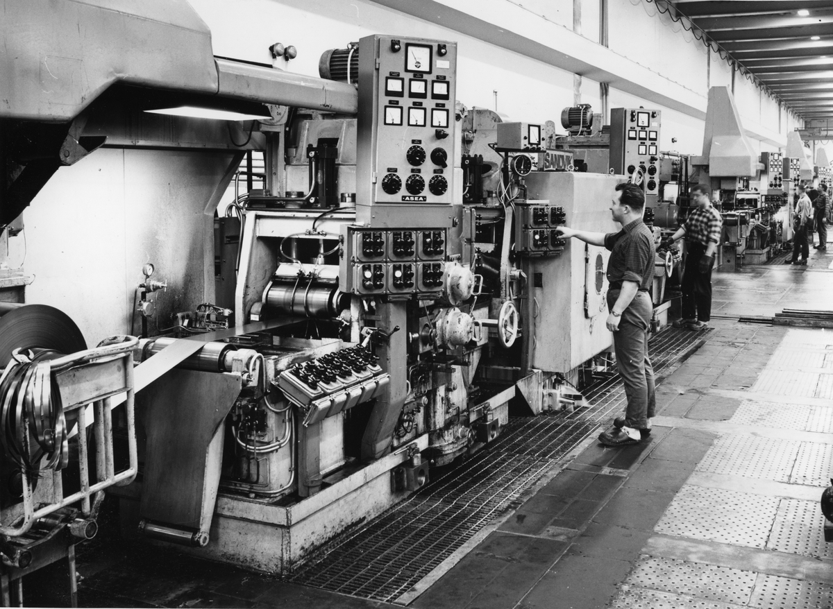 Sandvikens Järnverk (Sandvikens Jernverk). Kallvalsning av rostfritt rakklingstål i valsverk av Sandvikens egen konstruktion. Verken är bland annat utrustande med instrument för automatisk kontroll och reglering av bandtjockleken.