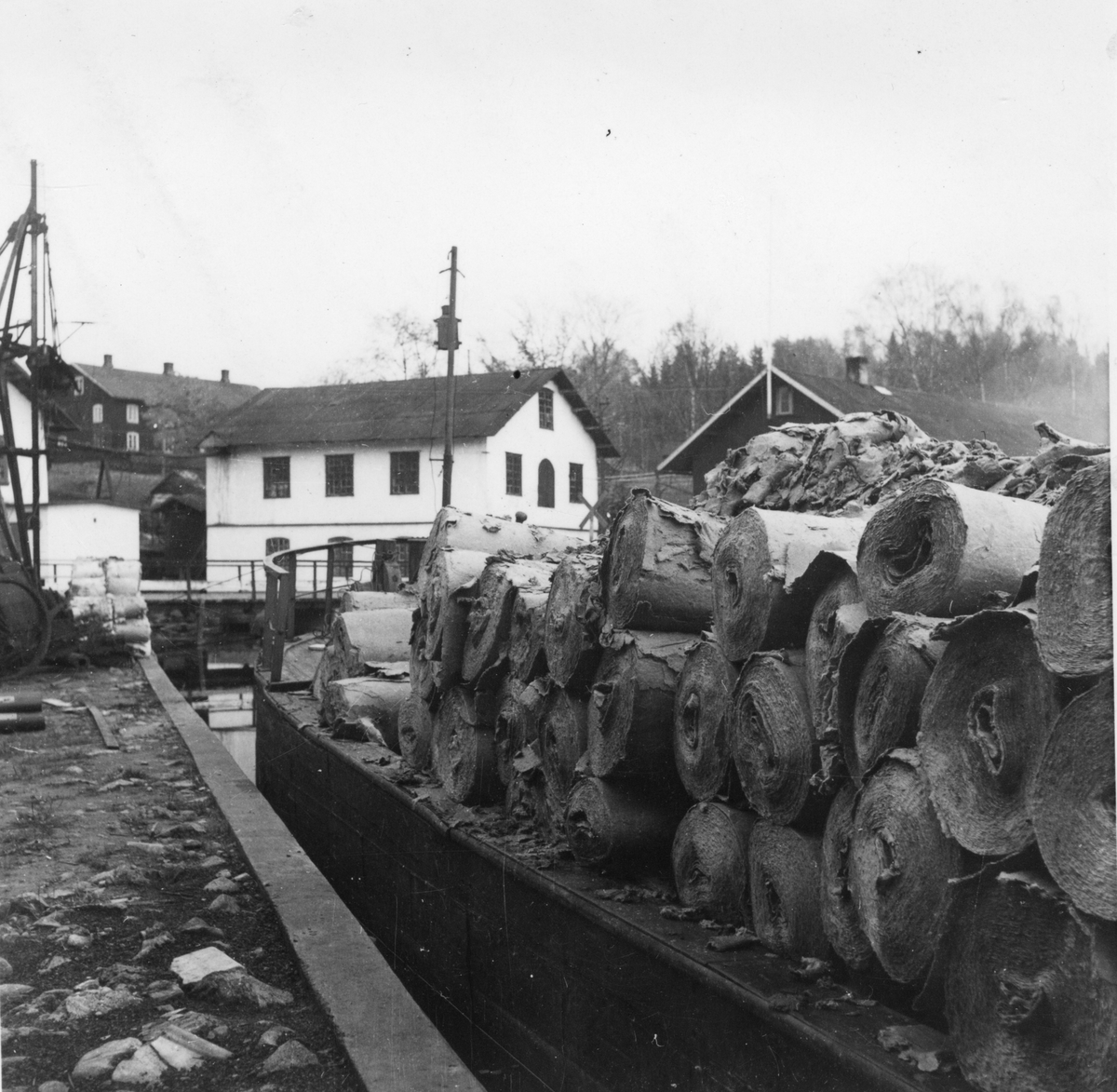 Gustafsfors Fabrikers Aktiebolag. Sulfatfabrik. En lastad massapråm. Uppåt till vänster arbetarebostaden Dal.