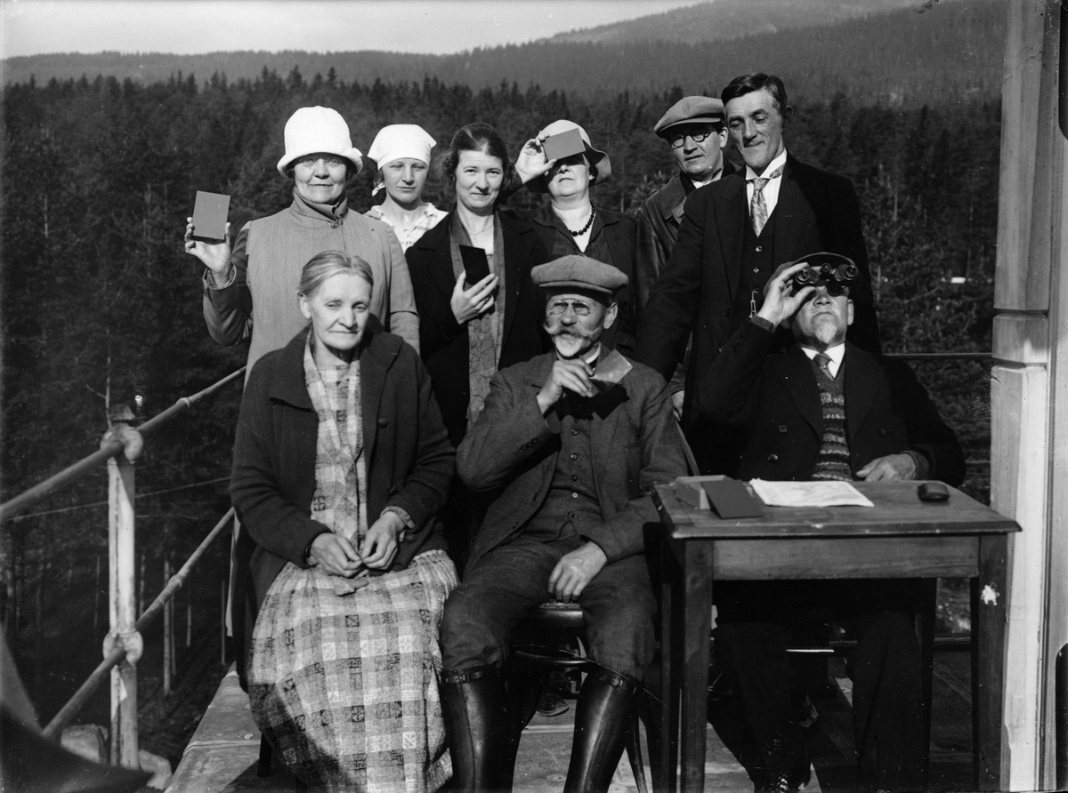 Carl Richard Nyberg, kallad Flyg-Nyberg tilsammans med flera personer. Bilden lämnad till Tekniska Museet av fru Greta Broberg, Stockholm, genom filmhistoriska samlingarna jan. 1952.
