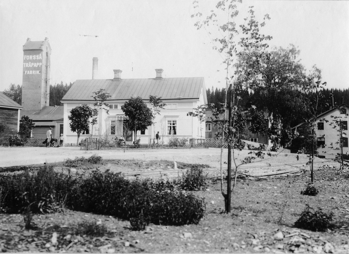 Forsså Träpappfabrik. Från vänster: torktorn, ingenjörsbostad, kontorsbyggnad, gamla pappfabriken.