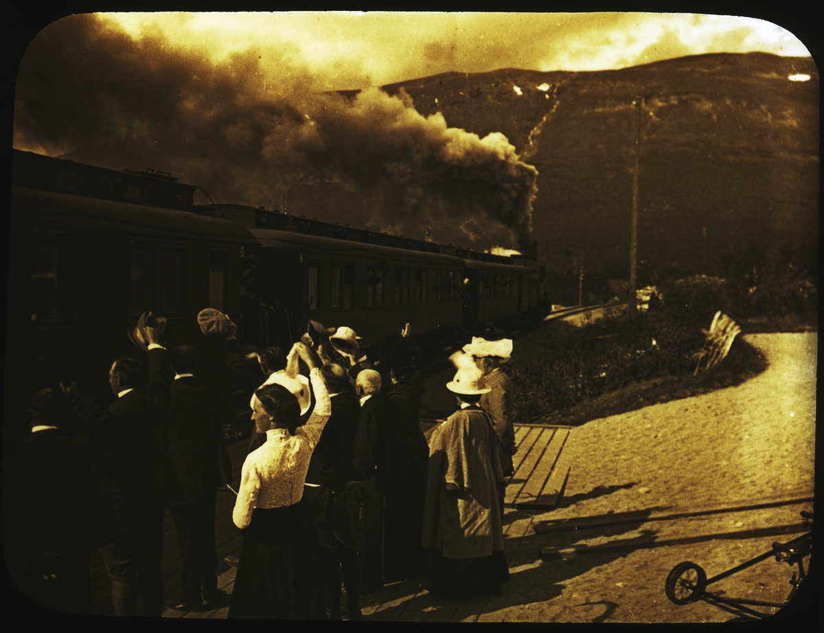 Kvinnor och män, vid en tågperrong, vinkar av tågresenärer (Silveromvandling, pga fukt och luft, kan ha gett bilden den gulbruna färgen).