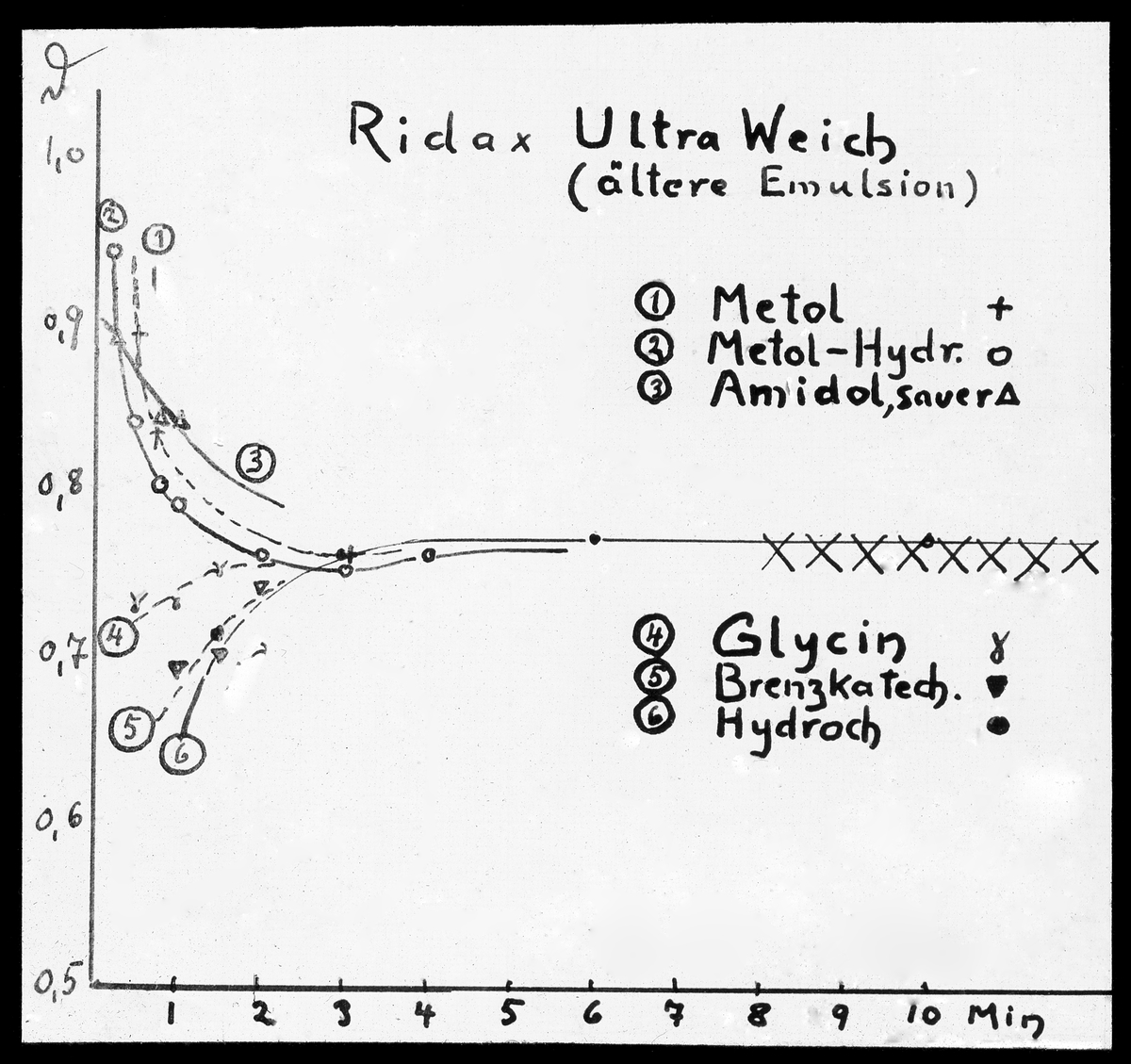 Skioptikonbild från instututionen för fotografi vid Kungliga Tekniska Högskolan. Använd av professor Helmer Bäckström som föreläsningsmaterial. Bäckström var Sveriges första professor i fotografi vid Kungliga Tekniska Högskolan 1948-58. Motiv föreställande "Ridax Ultra Weich" (ältere emulsion) (För mer text se bilden).