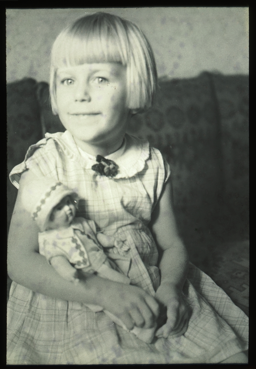 Skioptikonbild från institutionen för fotografi vid Kungliga Tekniska Högskolan. Använd av professor Helmer Bäckström som undervisningsmaterial. Bäckström var Sveriges förste professor i fotografi vid Kungliga Tekniska Högskolan 1948-1958. Flicka med docka. På bilden står skrivet: Krom- och järnsalter. För mer info: se Fotografisk Handbok av Helmer Bäckström. Natur och Kultur. Andra omarbetade upplagan 1958-59. Kap. 75-79 Toningsförfaranden för silverbilder (sid 585 och följande).