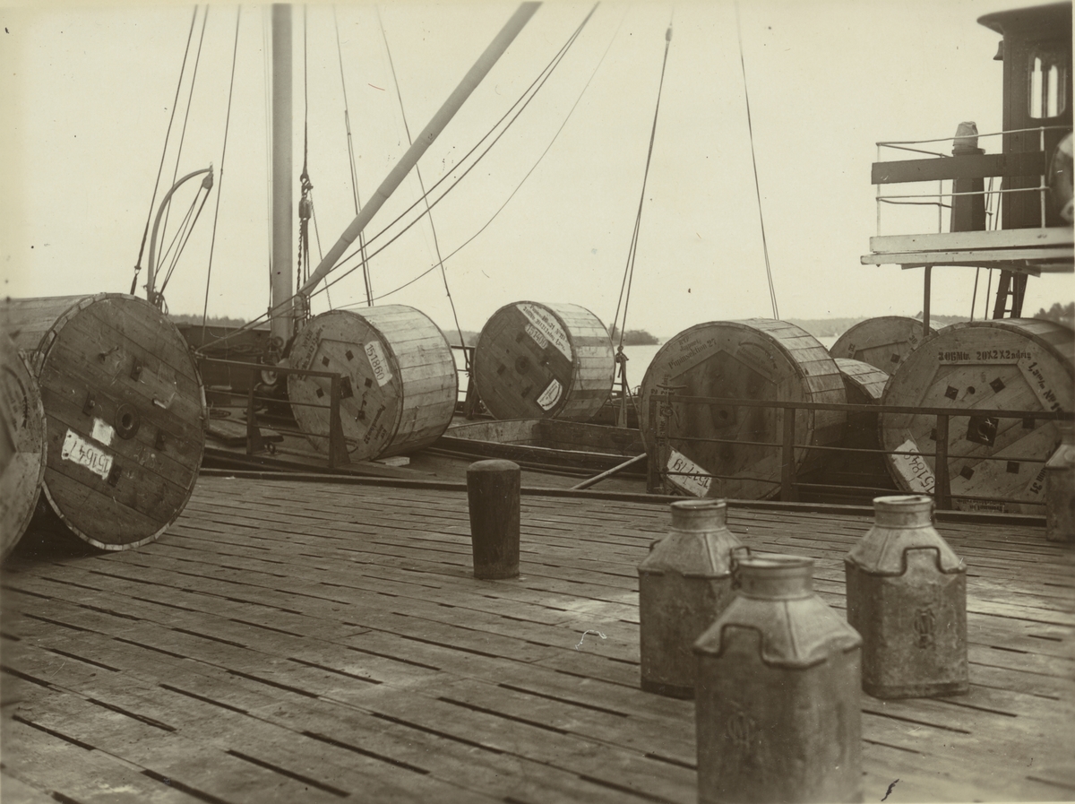 Hjälmsätrakabeln. En del av kablarna lossas vid Östanå brygga. Ur albumet Kabelarbetet Hjälmsälra (Hjälmsättra) - Norrtälje - Finnviken utfört under sommaren 1928.