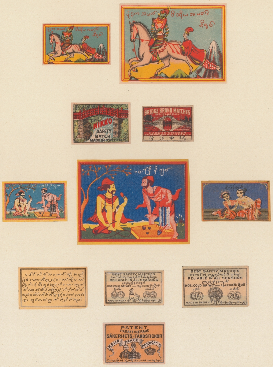 Etiketter för tändsticksaskar, från Svenskt Industri- och Handelsmuseum.