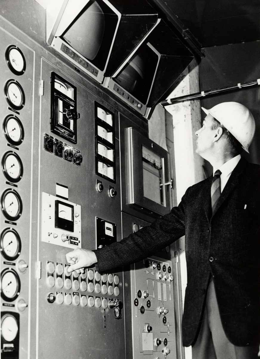 Anläggningen levererad av Stal-Laval Apparat AB, Linköping. Manövertavla försedd med land annat TV-mottagare på vilken avgasningsprocessen inne i vacuumtanken kunde följas.