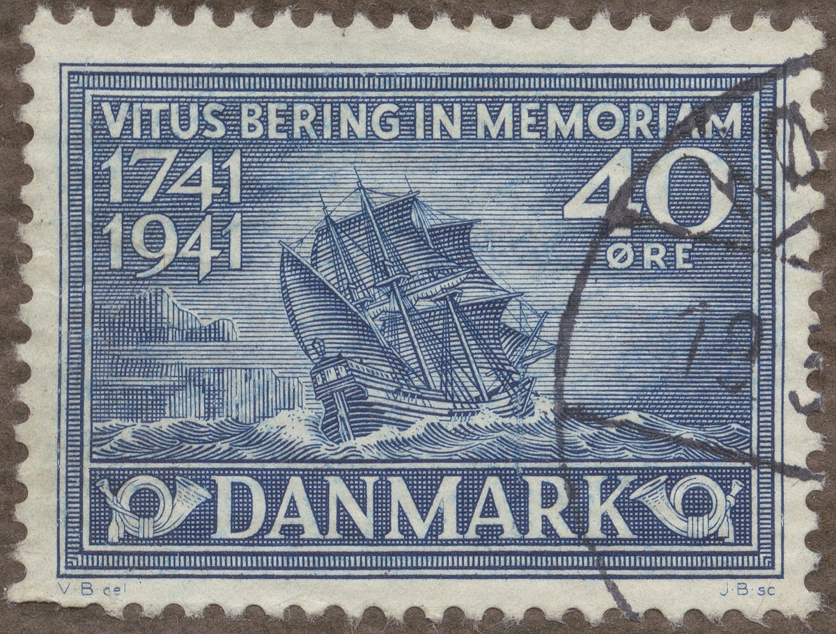 Frimärke från Danmark, 1941. Motiv av Dansk bark från början av 1700-talet. Det fartyg med vilket Vitus Bering upptäckte sundet ("Berings Sund") mellan Nordamerika och Asien. 200-årsminne av Berings död Vitus Jonassen Bering 1681-1741