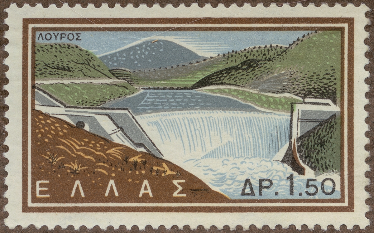 Frimärke ur Gösta Bodmans filatelistiska motivsamling, påbörjad 1950. Frimärke från Grekland, 1962. Motiv av "Serie Greklands elektrifiering". Louros-dammen.