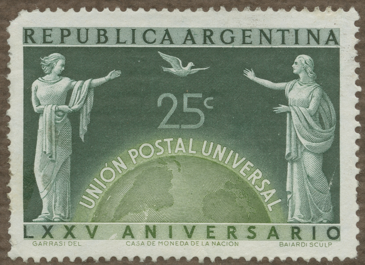 Frimärke från Argentina, 1949. Motiv av Sydamerika mm, på jordglob. "Världspostföreningen 75 år".