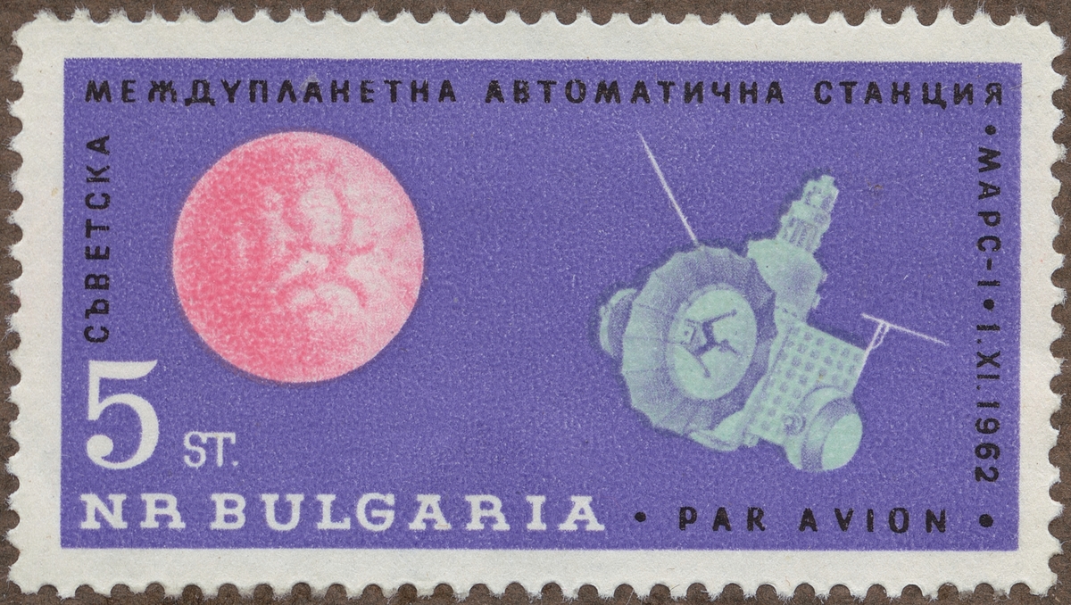 Frimärke från Bulgarien, 1963. Motiv av Planeten Mars och den automatiska stationen "Mars 1".