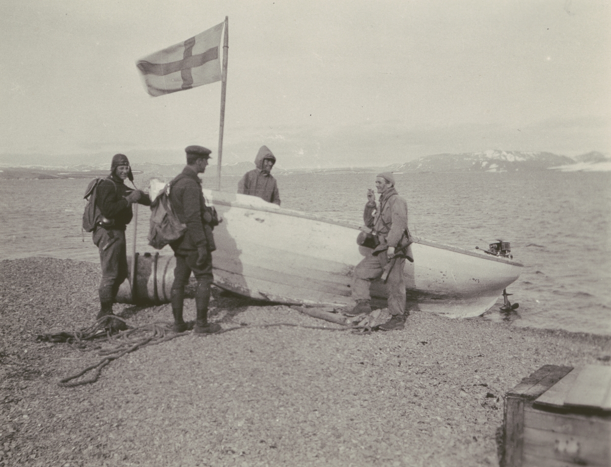 Fotografi från Ahlmannexpeditionen 1931. Motiv av fyra män vid båt på strand.