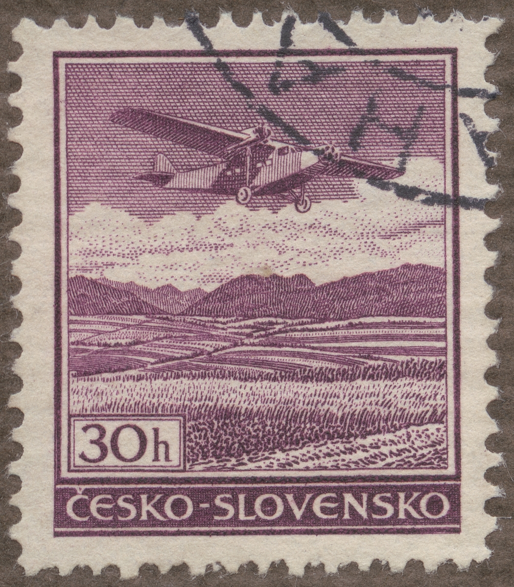Frimärke från Tscheckoslovakien, 1939. Motiv av Monoplan över tjeckoslovakisk landsbygd. "1930-typ märke med bindestreck i "Cesko-Slovenko"