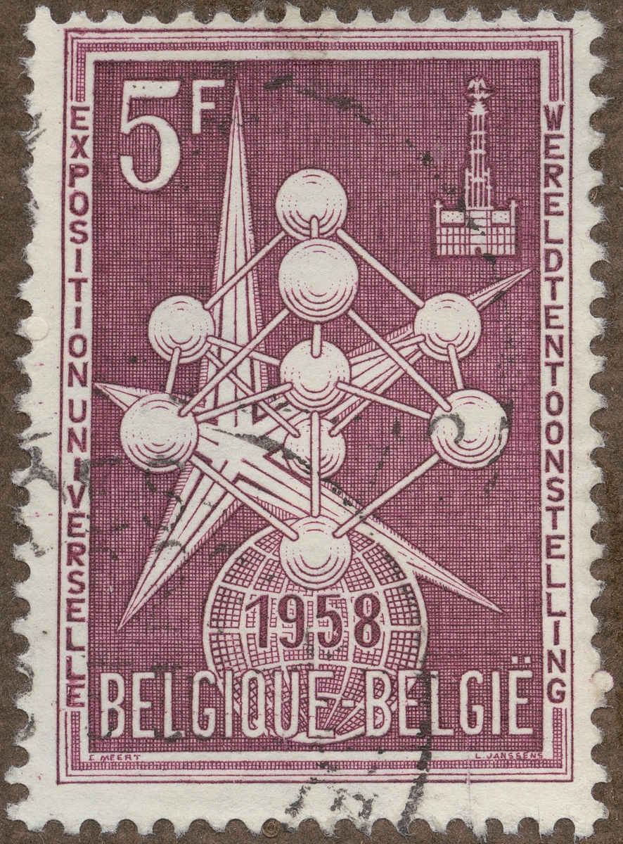 Frimärke ur Gösta Bodmans filatelistiska motivsamling, påbörjad 1950. Frimärke från Belgien, 1958. Motiv av "Atomium" "Utställningsbyggnad i Bryssel 1958 Varje kula: c:a 30 m i diameter"