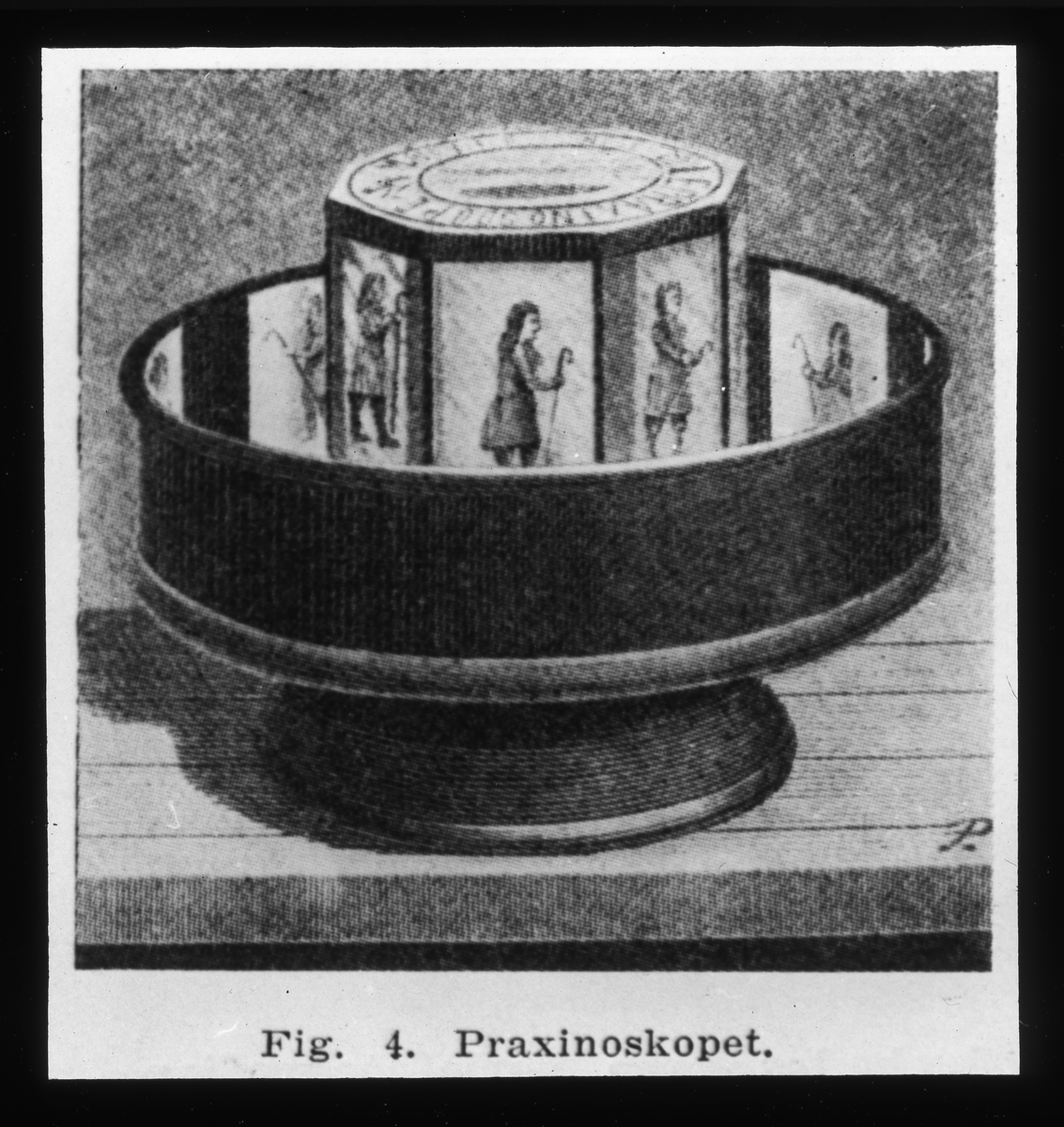 Praxinoskop. Optisk leksak för illusion av rörliga bilder. Filmens föregångare.