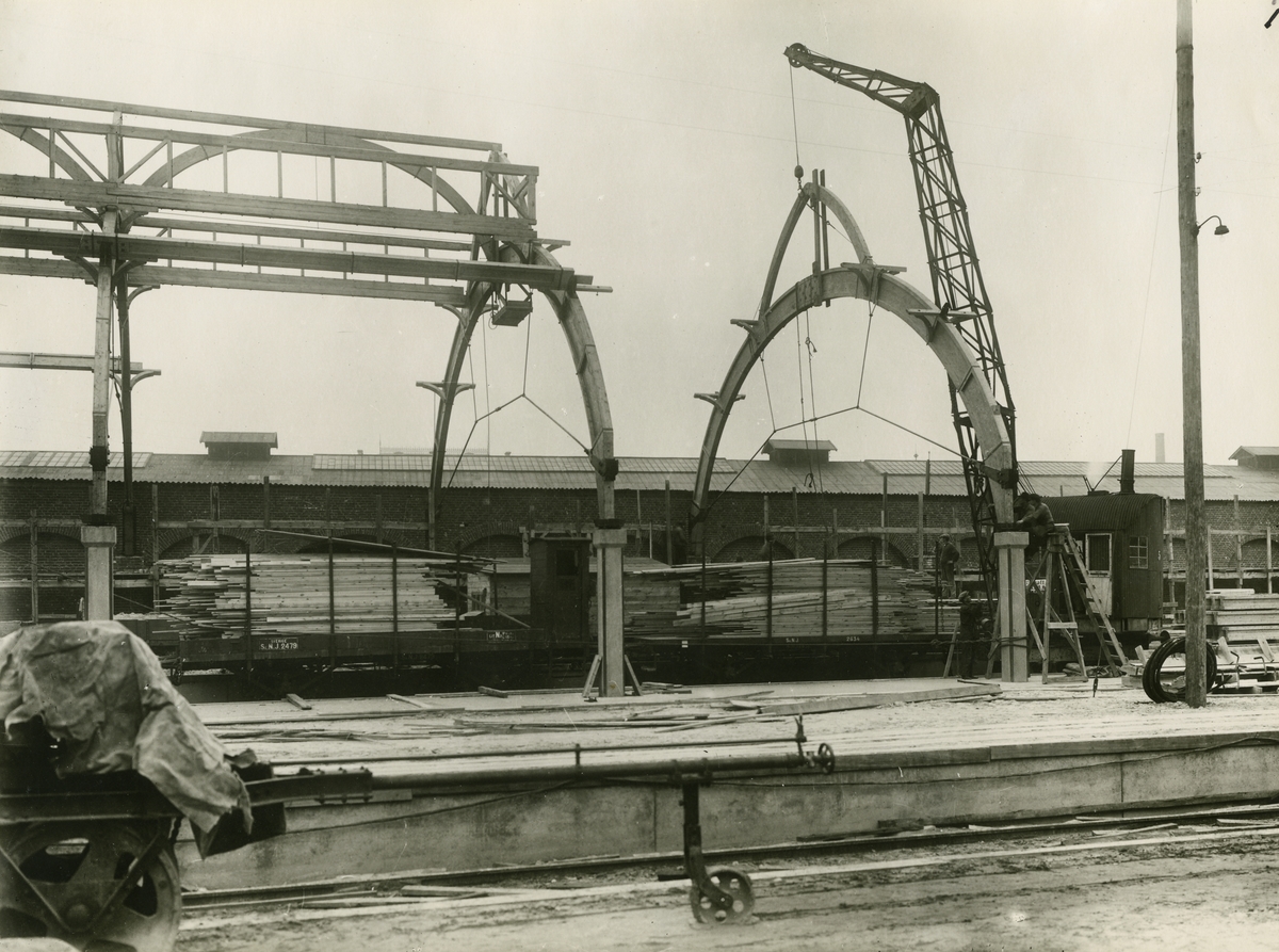 Byggandet av banhallar i Malmö. Tillverkad av AB Fribärande Träkonstruktioner i Töreboda.