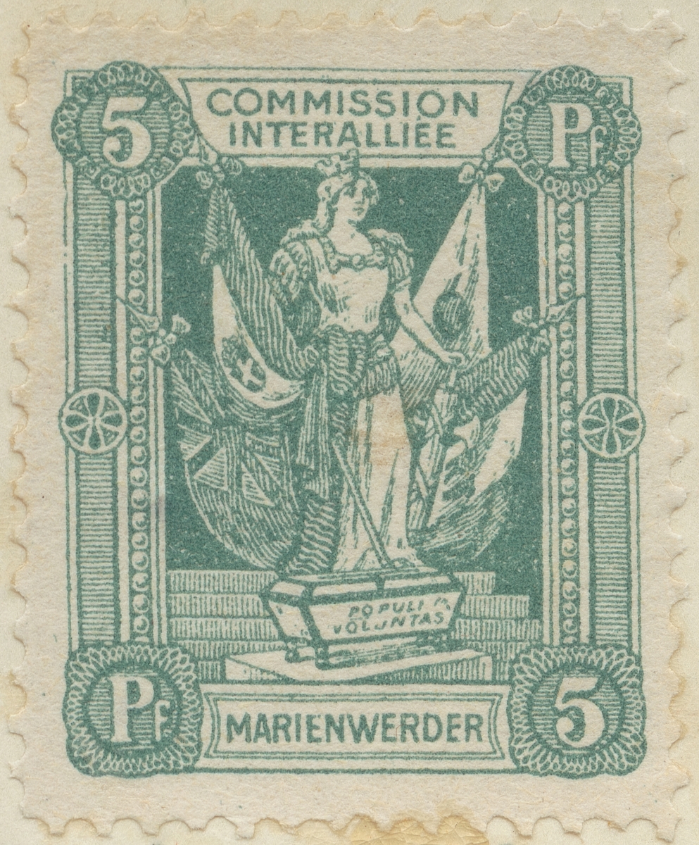 Frimärke från Marienwerden (nuv. Tyskland), 1920. Motiv av Ententens Flaggor: -Symbol för Ententens övervakning av plebiscitet i Marienwerden, 1920- (f.d. Polen enligt Versailles fredstraktaten 1919)
