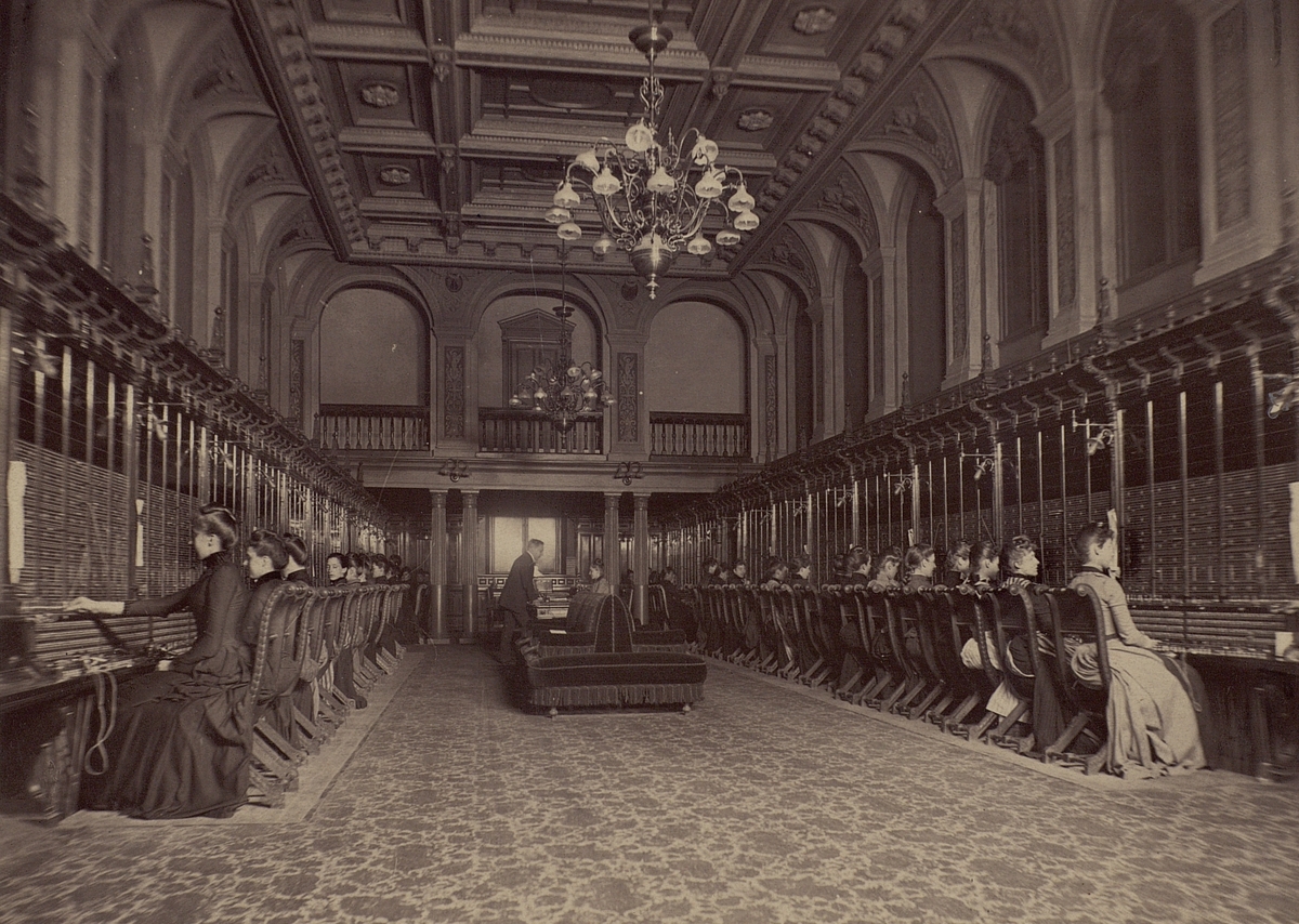Malmskillnadsgatan 30. Allmänna Telefon ab:s första telefonsal. Bilden från år 1888.
