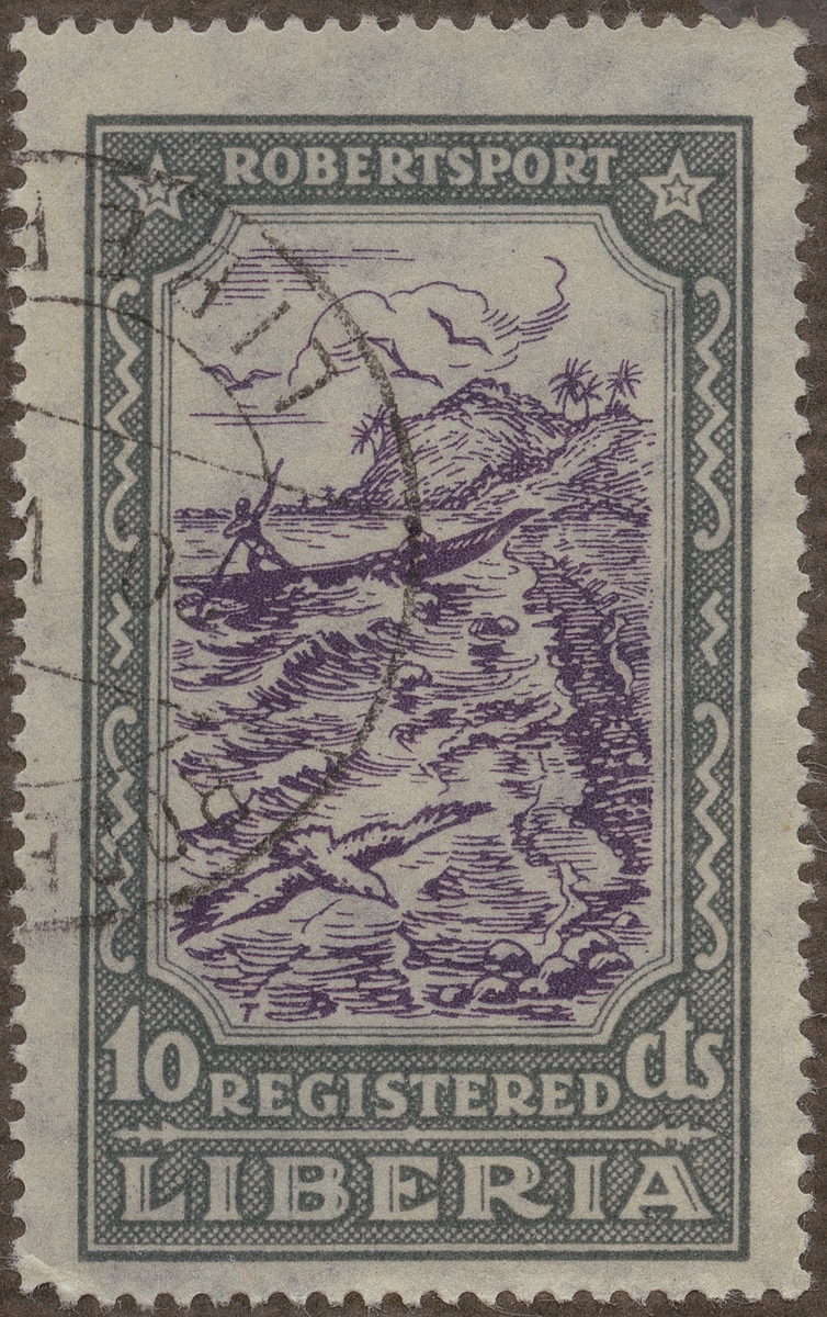 Frimärke från Afrika: Liberia, 1928. Motiv av Landning genom bränningar med båt.