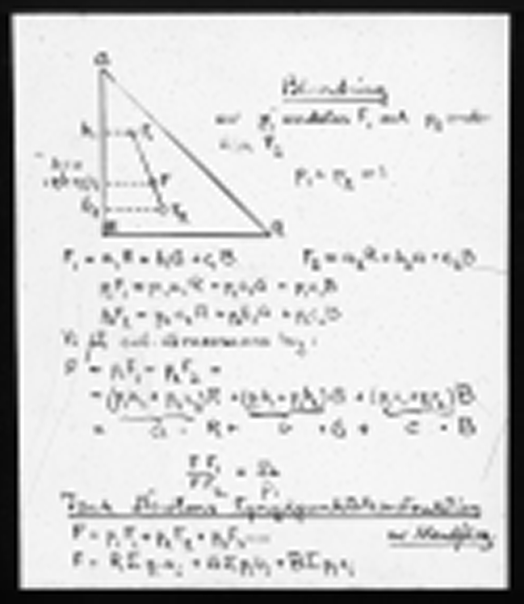 Skioptikonbild från institutionen för fotografi vid Kungliga Tekniska Högskolan. Använd av professor Helmer Bäckström som föreläsningsmaterial. Bäckström var Sveriges första professor i fotografi vid Kungliga Tekniska Högskolan 1948-58. Motiv föreställande "Grassmans lag". (För mer text se bilden). För mer info se: Bäckström, Helmer. Fotografisk Handbok. Andra omarbetade upplagan. Natur och Kultur. Stockholm. 1948-59. Kap. 128 Trikolorimetri s. 958 och följande.