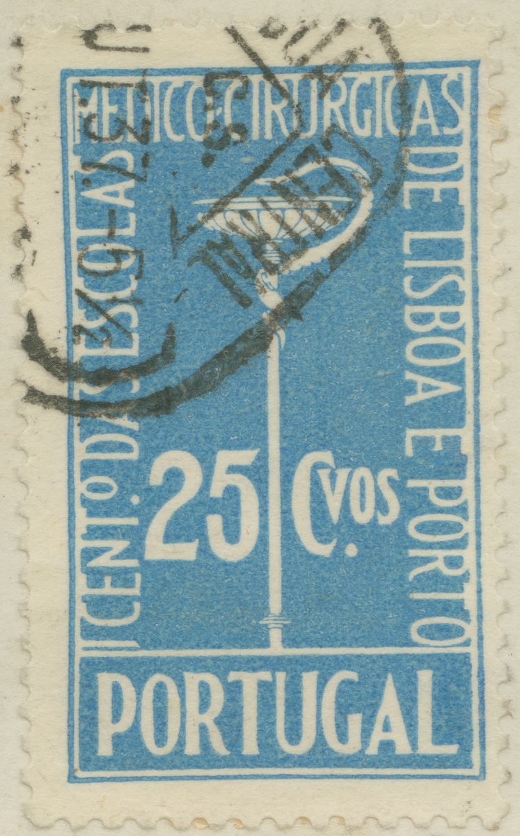 Frimärke från Portugal, 1937. Motiv av symbol för läkekonsten: skål med Askelopiosormen. "100-årsjubileum av de medicinska fakulteterna vid Lisbonne och Porto Universitet.
