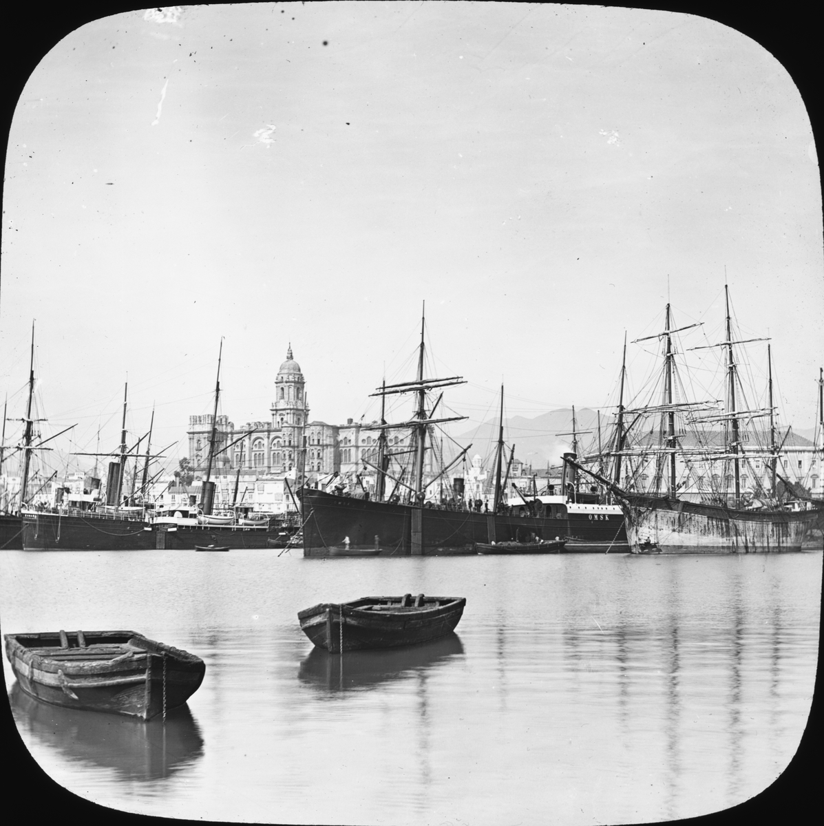 Skioptikonbild med motiv av hamnen i Malaga, Spanien.
