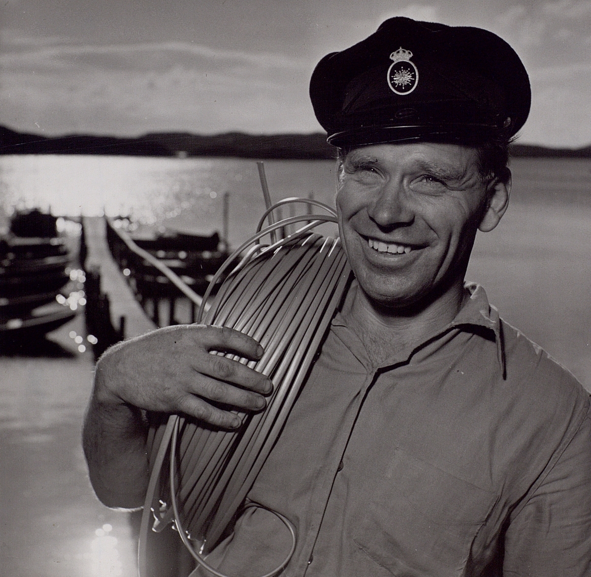 Motiv från Göteborgstrakten 1956. Hilmer Hansson går iland på en av sina öar med tukatråden över axeln.