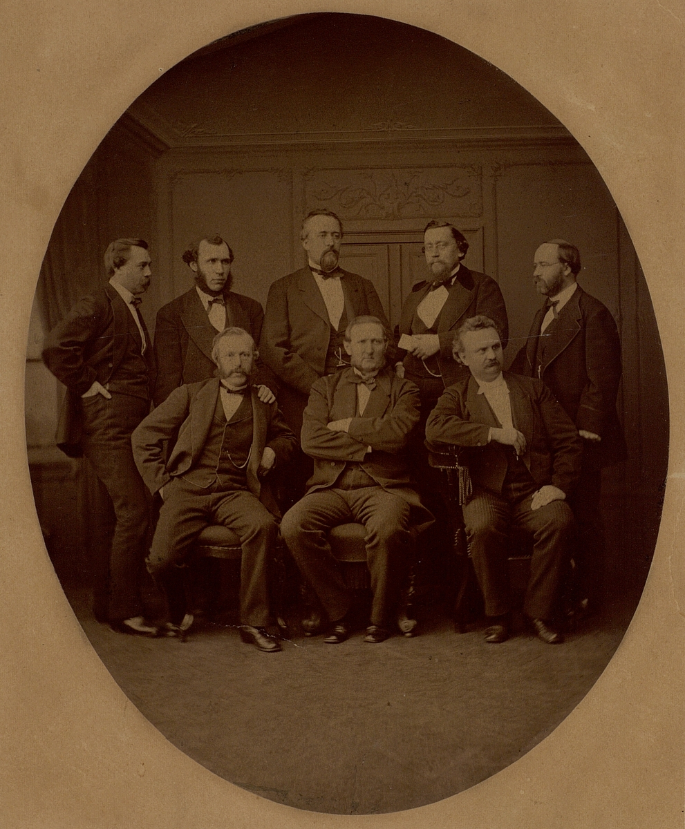 Pensionskommittén 1874. Bakre raden f.v. : T Lidman, M Wennman, G Lybeck, E Hedlund, A Gumaelius. Främre raden f.v.: L V Platen, D Kiellander, G Näsman.
