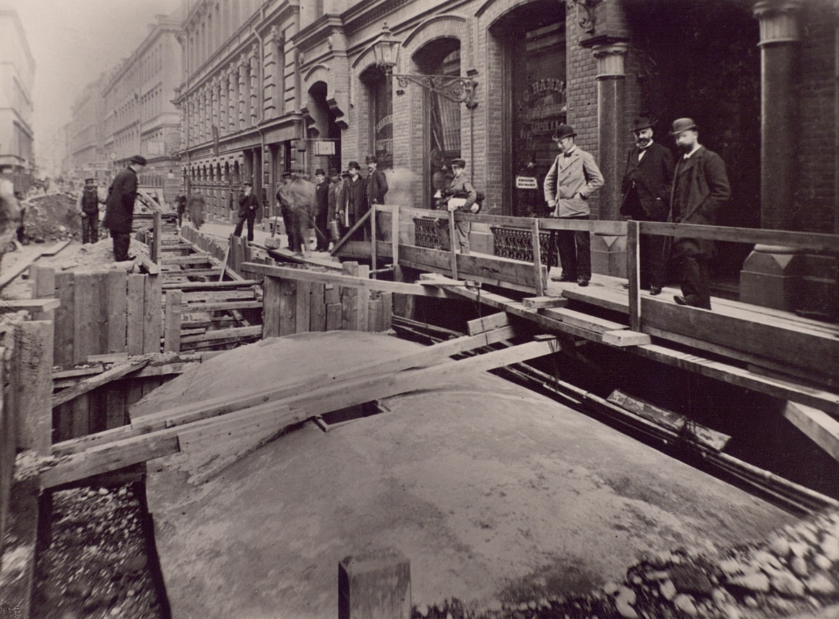 Kabelbrunn vid Allmänna Bolagets hus nr 30 med ledningar mot norr. (1895). Vid husets port står ingenjör Celion, direktör Cedergren och ingenjör Kjellström.